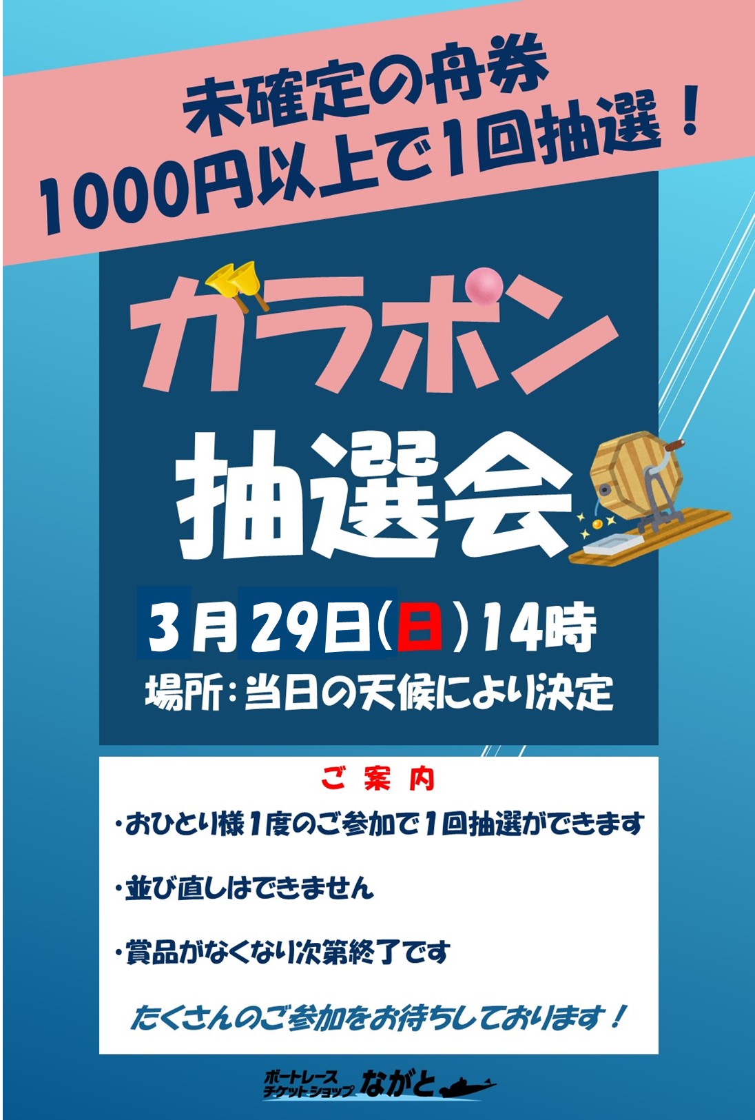 3月29日(日) 14時よりガラポン抽選会を開催いたします。
